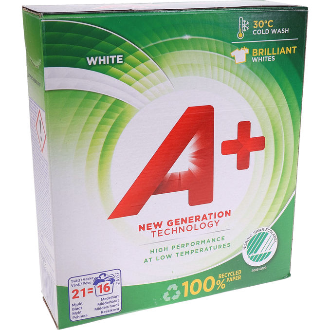 A+ joutsenmerkitty pyykinpesuaine valkopyykille, joka on tehokas jo 30 asteessa. Pakkaus on tehty kierrätysmateriaaleista ja on täysin kierrätettävissä.
