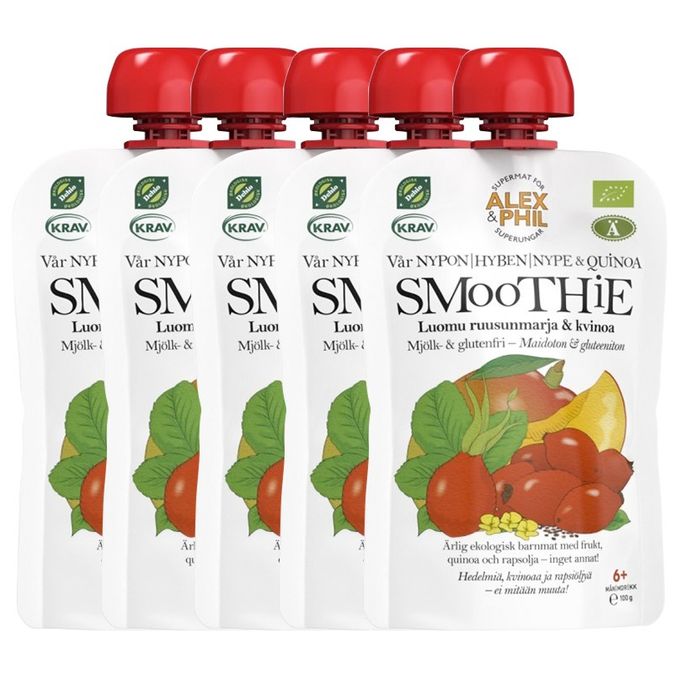 Luomu, maidoton ja gluteeniton ruusunmarja ja kvinoa smoothie. Sopii lapsille 6kk iästä alkaen.