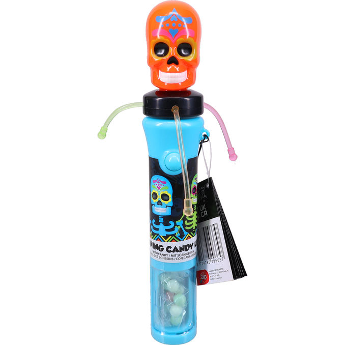 Värikäs karkkilelu, jonka päällä on pyörivä pääkallo ja säiliössä pieniä karkkeja. Hauska ja interaktiivinen yllätys, joka yhdistää leikin ja makeat karkit värikkäässä muotoilussa.