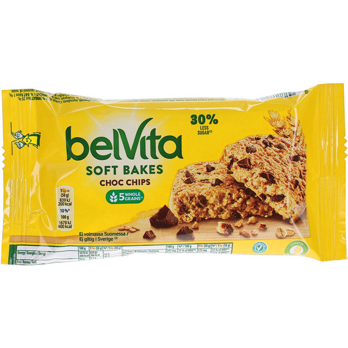 belVita Soft Bakes Choc Chips - Pehmeäksi paistettuja herkullisia täysjyväkeksejä, joissa seassa runsaasti suklaahippuja. belVita Breakfast keksit todistetusti vapauttavat hiilihydraatteja hitaasti ja antavat energiaa neljäksi tunniksi. Nauti belVita keksi osana tasapainoista aamiaista tai ota mukaan välipalaksi.