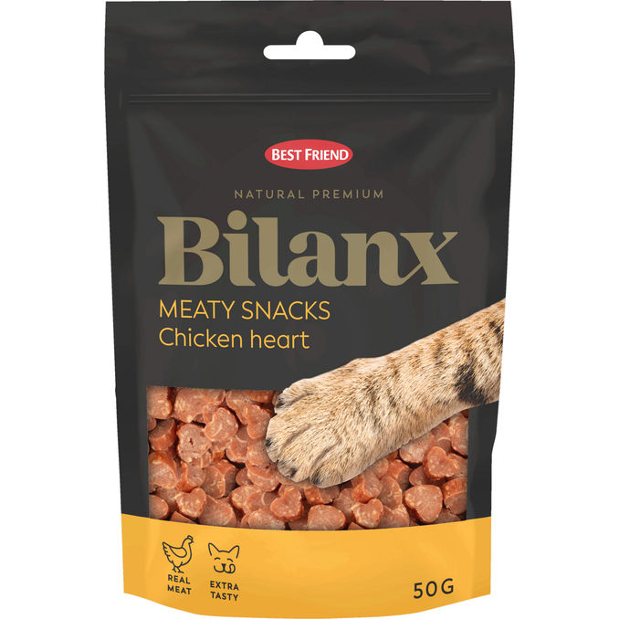 Bilanx Meaty Snacks kanalempiherkut ovat supermaukkaita ja suloisia kissan herkkuja, jotka sisältävä runsaasti kananlihaa! Tämä sydämenmuotoinen herkku sopii kaikille aikuisille kissoille. Sen herkullisuuden ja koon ansiosta tämä kissan makupala sopii täydellisesti hemmotteluun. Bilanx lihaisat kanalaempiherkut ovat viljattomia ja sisältävät runsaasti proteiinia ja aitoa kanaa. Turska lisää herkkujen houkuttelevuutta ja tuo hyviä rasvoja kissan ruokavalioon. Nämä kissan herkut eivät sisällä sokeria. Bilanx lihaisat herkut saavat kissasi kehräämään lisää!