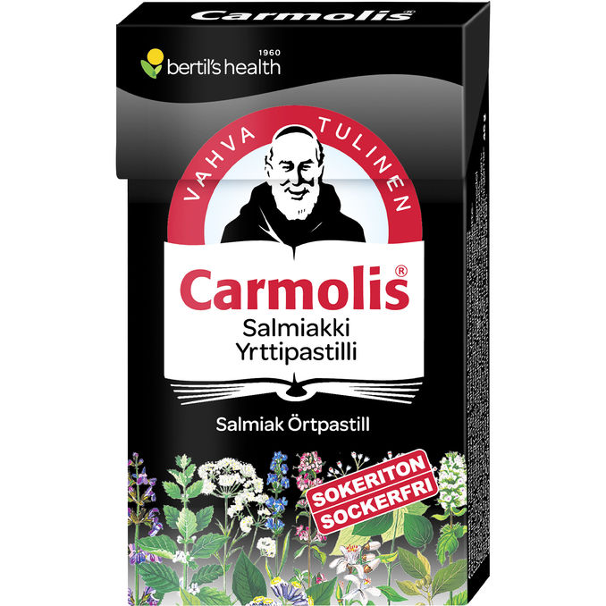 Sokerittomilla Carmolis Salmiakki yrttipastilleilla on vahvasti suuta lämmittävä vaikutus. Pehmeissä pastilleissa maistuu cayennepippuri ja vanhan luostarireseptin mukaan valmistettu Carmolis -öljy. Raikastaa suuta ja hengitystä.