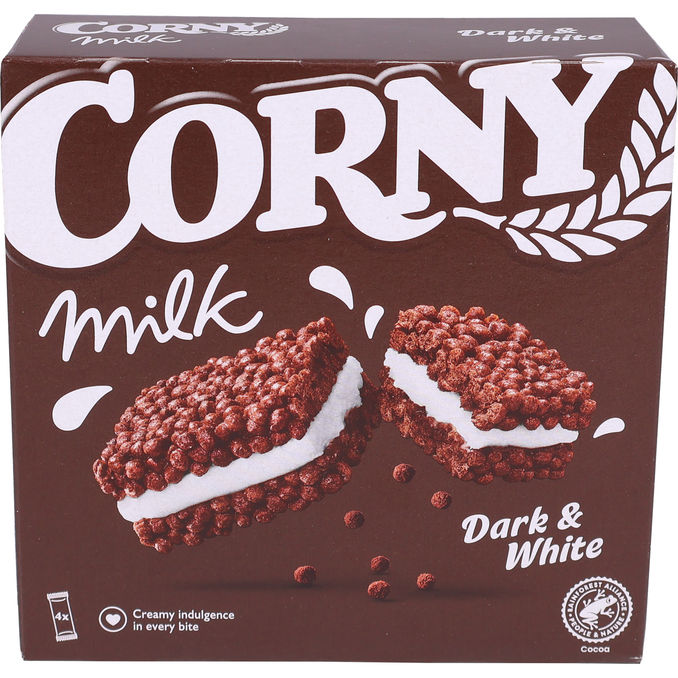Corny Milk Dark & White, välipalapatukka kaakaolla ja maitokreemitäytteellä, kätevässä monipakkauksessa! Superherkullinen täytepatukka, jossa on rapeita myslipaloja ja herkullista täytettä. Täydellinen eväs tai välipala, kun tarvitset lisäenergiaa. Kätevä multipakkaus, jossa 4 x 30g patukkaa.