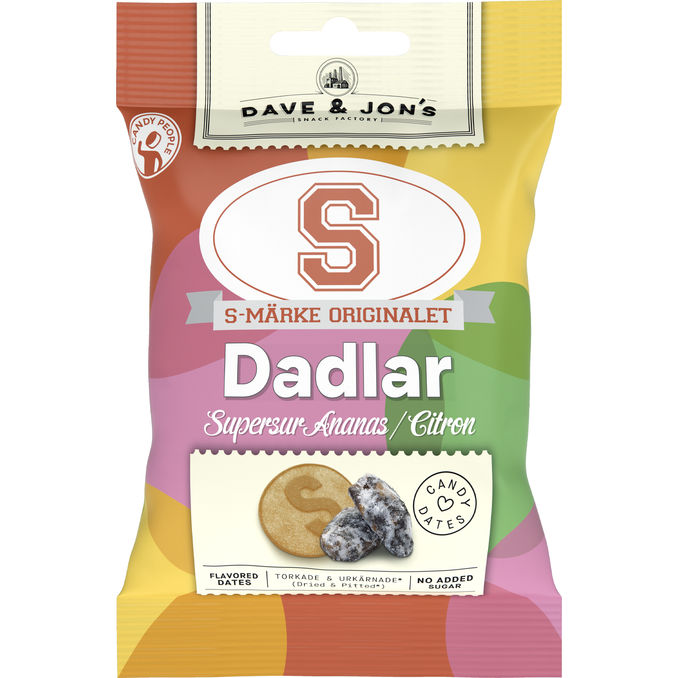 Dave&Jon's S-märke kirpeät taatelit ovat kivettömiä ananaksen ja sitruunan makuisia taateleita. Vegaaninen ja runsaskuituinen välipala arkeen.