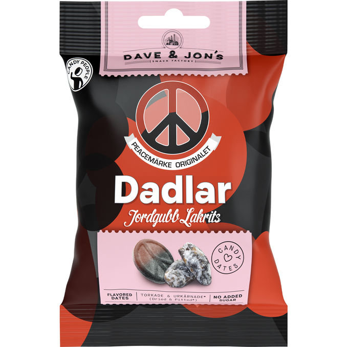 Dave & Jon’s Dadlar Peacemärke on pehmeä taatelivälipala, jossa luonnollinen makeus yhdistyy klassiseen Peacemärke-makumaailmaan. Mansikan, lakritsin ja kevyen suolaisuuden vivahteet tekevät herkusta täydellisen makuyhdistelmän. Sopii makeannälkään, välipalaksi tai kahvihetkeen. Sisältää runsaasti kuitua!