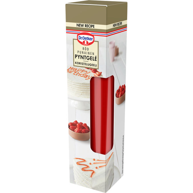 Läpikuultava punainen koristelugeeli soveltuu mainiosti kakkujen koristeluun.