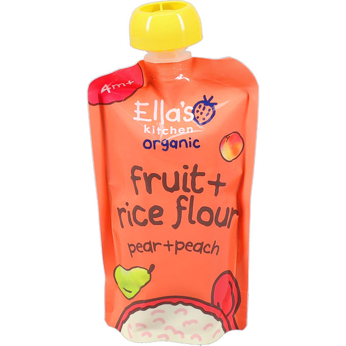 100% luomupersikoita, päärynöitä + riisiä soseena sekä tilkka sitruunamehua. Ei mitään muuta lisättyä, ei edes vettä.