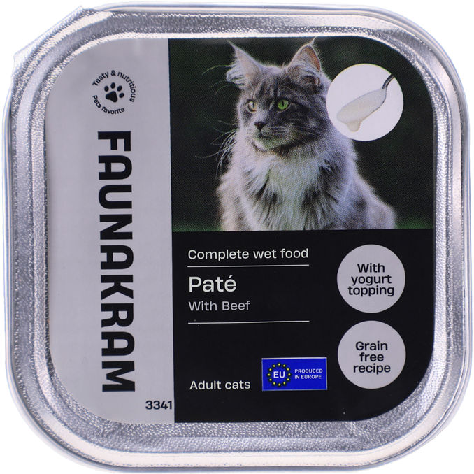 Faunakram kissapaté on täydellinen puolikostea märkäruoka, joka sisältää kaikki vitamiinit ja mineraalit, joita aikuinen kissasi tarvitsee. Ruoka on viljatonta ja sisältää herkullisia korkealaatuisia naudanlihakuutioita, ilman lisäaineita. Ruoka on päällystetty jogurtilla, mikä tekee siitä houkuttelevan ja maukkaan. Patéa voidaan käyttää myös kuivaruokien päällä, mikä tekee aterian houkuttelevammaksi jopa nirsoille kissoille. Tuote on kehitetty yhteistyössä ravitsemusasiantuntijoiden, eläinlääkäreiden ja kasvattajien kanssa varmistaakseen korkeimman laadun ja korkean asiakastyytyväisyyden.