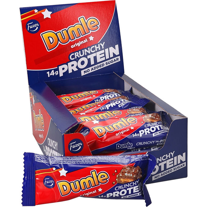 Dumle Crunchy Protein patukka yhdistää pehmeän Dumlenmakuisen toffeesydämen, proteiinichoco nougatin, rouskuvat proteiinikrispit ja maitosuklaan. 45 g:n patukassa on proteiinia 14g ja sokeria vain 1,5g. Vihdoin herkullinen proteiinipatukka. Se parempi herkku.