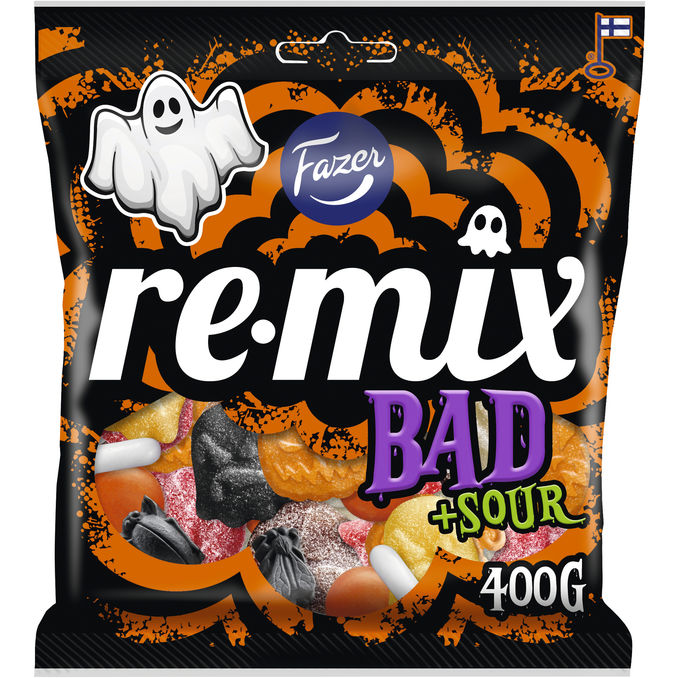 Karkkihyllyn monipuolisin sekoitus Remix tarjoaa vaihtoehtoja jokaiseen makuun. Remix Bad tarjoilee Halloween-sesongin hirvittävimmän karkkisekoituksen kirpeitä kummituksia ja kurpitsoja, salmiakkisia ötököitä, suklaata ja rapeita lakurakeita. Mukana myös Remix Mad -pussista tutut suosikkikarkit energinen hedelmä ja cola! Monipuolinen karkkipussi käynnistää kauhuleffaillan ja Halloween-juhlat ja sopii isommankin seurueen hurjaan herkutteluun.