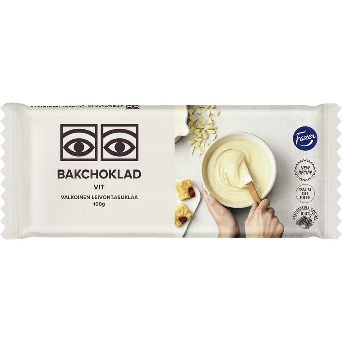 Fazer Ögon Valkoinen leivontasuklaa -tuotteessa on hennon pehmeä suklaan maku ja se sopii täydellisesti leivontaan, suklaisiin jälkiruokiin, tuoreiden marjojen tai jäätelön kanssa.