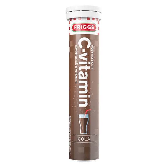 Friggs C-vitamiini Cola-poretabletit ovat sokerittomia ja nopeasti liukenevia. 1 tabletti sisältää 1g C-vitamiinia. C-vitamiini on tärkeä vitamiini, joka suojaa elimistön soluja. Se edistää mös raudan imeytymistä, on hyväksi iholle, luustolle, hampaille ja verisuonille sekä edistää immuunijärjestelmän normaalia toimintaa.