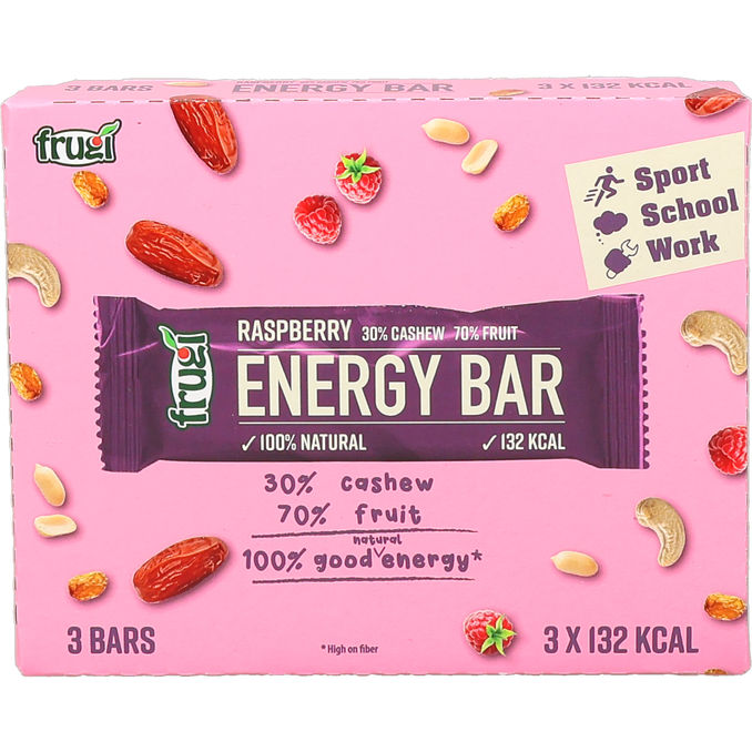 Vadelmainen energiapatukka, joka sisältää 30 prosenttia cashewpähkinöitä ja 70 prosenttia hedelmiä, mikä antaa luonnollista makeutta ja hyvää energiaa. Kätevä kolmen kappaleen pakkaus. Yksi patukka sisältää 132 kilokaloria, ja se sopii erinomaisesti välipalaksi ennen suoritusta tai sen jälkeen.