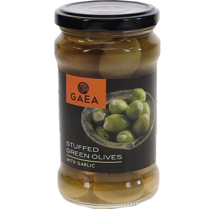 Vihreät oliivit valkosipulilla täytettynä. Sopivat hyvin esimerkiksi salaatteihin.