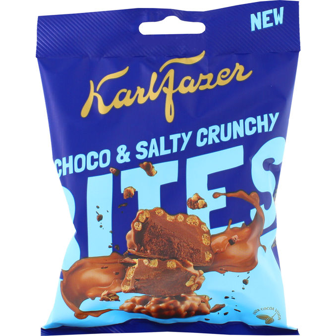 Koe vastustamaton makujen ja koostumusten yhdistelmä! Karl Fazer crunchy bites -pussista löydät uudet, vastustamattomat suklaaherkut, jotka ovat ylellinen sekoitus täyteläistä, pehmeää suklaata ja rapeita crispejä ripauksella suolaa. Karl Fazer crunchy bitesissa erilaiset tekstuurit yhdistyvät herkullisella tavalla tarjoten ainutlaatuisen ja täyteläisen makuelämyksen. Nauti vastustamattomasta makean ja suolaisen yhdistelmästä, joka saa sinut ottamaan vielä yhden palasen!