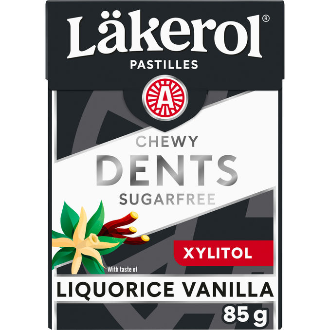 Läkerol Dents Liquorice Vanilla on herkullinen lakritsin ja vaniljan makuinen ksylitolipastilli. Pastilleissa on ainutlaatuinen pureskeltavan pehmeä koostumus. Ksylitolia ja maltitolia sisältävien pastillien nauttiminen edistää hampaiden mineralisaation ylläpitämistä. Mineralisaatio tarkoittaa hammaskiilteen kovettumista. Pastillilla on Suomen Hammaslääkäriliiton suositusmerkki.