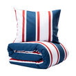 Tämä 100-prosenttisesta puuvillasta valmistettu vuodevaatesetti tarjoaa raikkaan raitakuvion, joka antaa makuuhuoneelle klassisen merellisen tunnelman. Pussilakana 150x210 cm ja tyynyliina 50x60 cm ovat pehmeitä ja kestäviä.