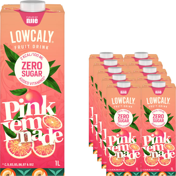 Lowcaly Pink Lemonade -sokeriton ja vitaminoitu sitruuna-limonadin makuinen juoma.
