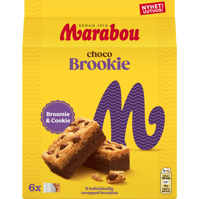 Marabou Choco Brookie - päältä suklaahippukeksi, alta brownie! Tämä uudenlainen, herkullisen suklainen leivonnainen on täydellinen herkku omaan kahvihetkeen. Pakkaus sisältää 6 kpl yksittäispakattua palaa, jotka säilyvät tuoreina pakkauksen avaamisen jälkeen ja ovat käteviä kerta-annoksia myös mukaan otettavaksi. Mmm...Marabou!