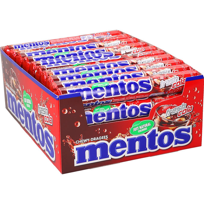 Raikkaita Colan makuisia pastilleja, joissa on pureskeltavan sitkeä sisus. Mentos -makeiset tunnistaa tutusta rullakääreestä