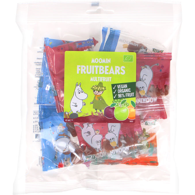 Muumi Fruitbears -hedelmänallet ovat hauska ja terveellinen välipala lapsille ja aikuisille. Luomu, vegaanisia ja valmistettu 96 % hedelmistä, ja ne maistuvat ihanasti omenalle, mangolle ja passionhedelmälle. Pakkaus sisältää kahdeksan pientä annospussia, jotka on helppo ottaa mukaan.