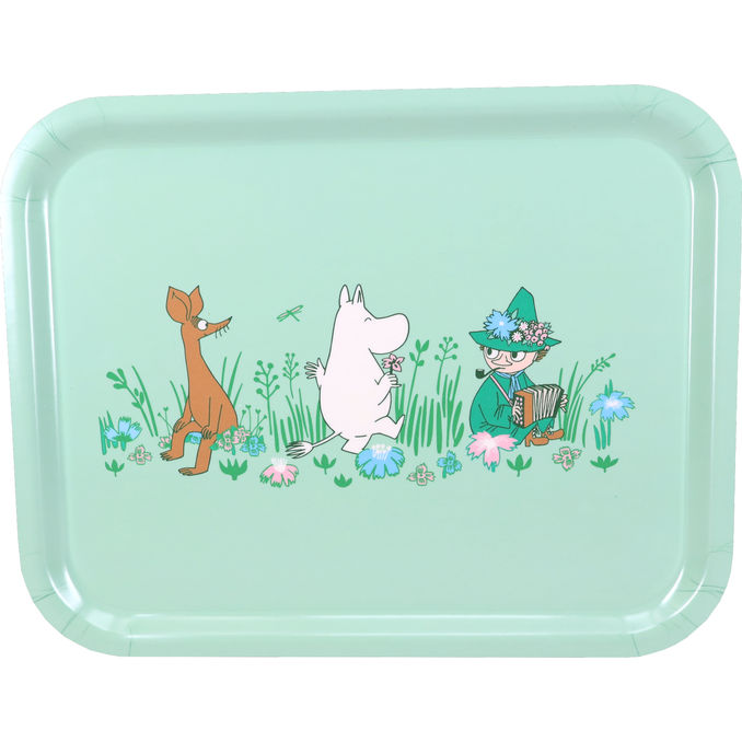 Koivuvanerinen tarjotin leikkisällä Muumi-kuviolla, jossa Muumipeikko, Nuuskamuikkunen ja Nipsu kävelevät kukkien keskellä Muumilaaksossa. Tarjotin on valmistettu Ruotsissa, kestää konepesun ja sopii täydellisesti kahvihetkiin, aamiaiselle tai tarjoiluun.