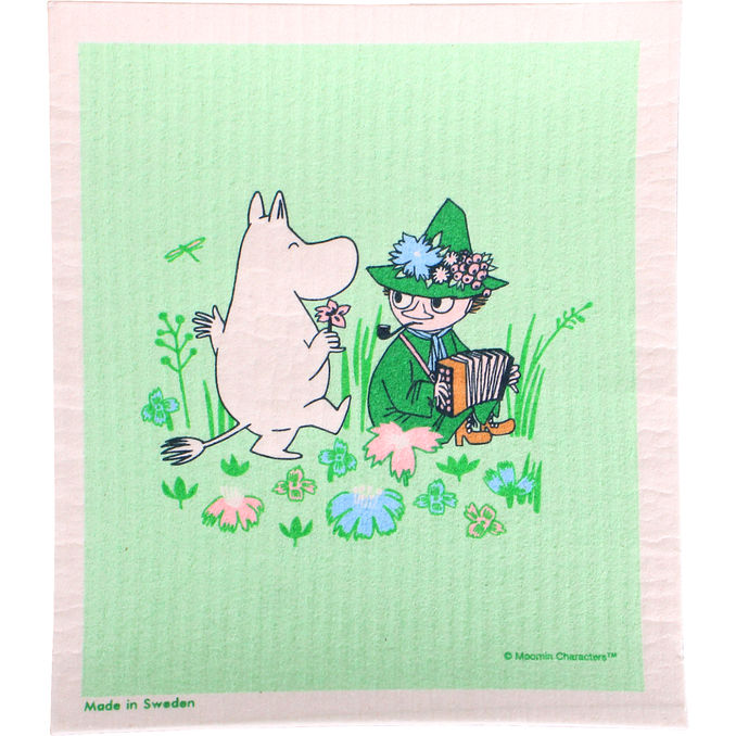 Tiskirätti, jossa on kuvio kesämaisemassa olevista Muumipeikosta ja Nuuskamuikkusesta. Käytännöllinen ja imukykyinen liina, joka sopii täydellisesti keittiön päivittäiseen puhdistukseen.