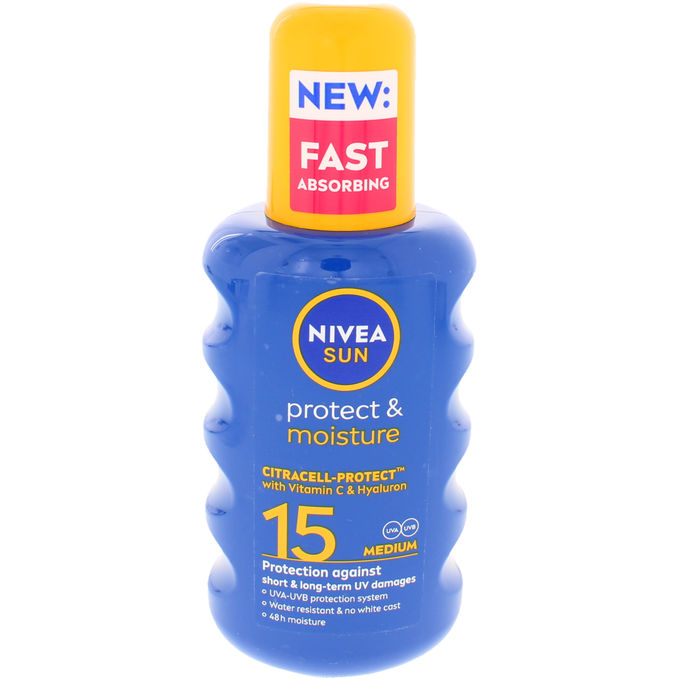 NIVEA SUN Protect & Moisture Sun Spray SK15 -aurinkosuojasuihke sisältää erittäin tehokkaan UVA/UVB-suodattimia, joiden suhde on ihon suojauksen kannalta optimaalinen. Suojakerroin 15. Antaa luotettavan ja pitkäkestoisen suojan palamiselta ja ehkäisee ihon ennenaikaista vanhentumista sekä aurinkoallergioita. Vedenkestävä ja hoitava voide syväkosteuttaa tehokkaasti ja pitkävaikutteisesti sekä vahvistaa ihon omaa mikrobiomia. Imeytyy nopeasti, ei jätä ihoa tahmeaksi. NIVEA SUN -tuotteilla voit olla huoletta auringolta suojattuna. Dermatologisesti testattu.