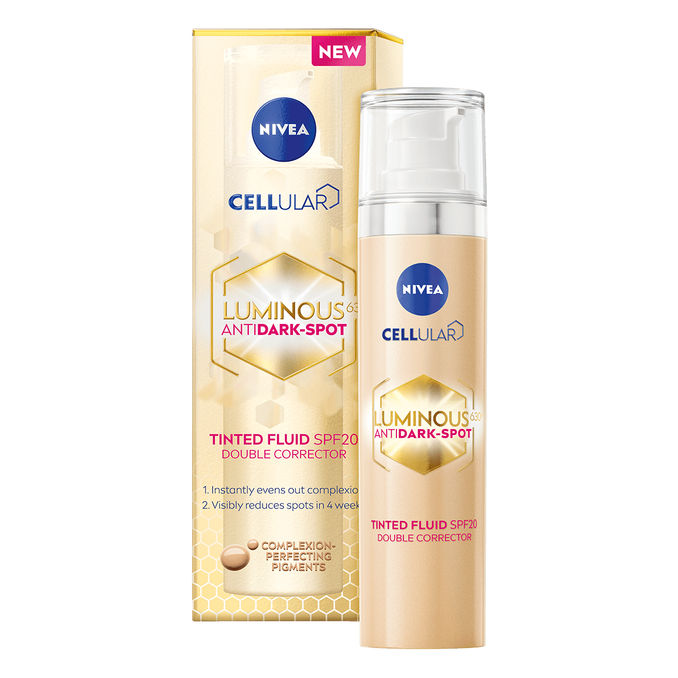 NIVEA Cellular Luminous630 Anti Dark-Spot Tinted Fluid SK20 -sävyttävä päivävoide ei pelkästään estä pigmenttiläiskiä tummenemiselta vaan myös vaalentaa olemassa olevia pigmenttiläiskiä! Sekä antaa luonnollisen kauniin peittävyyden! Kasvovoide mukautuu jokaiseen ihon sävyyn, tasoittaa samanaikaisesti ihon sävyeroja sekä rakennetta. Näkyvät tulokset 4 viikossa! Kosteuttaa, tekee ihosta sileän, kauniin säteilevän sekä luonnollisen mattapintaisen. Ehkäisee valovanhenemista, on hellävarainen ja sopii kaikille ihotyypeille, myös herkälle iholle. Lopputuloksena tasainen ja säteilevä iho. Innovatiivinen päivävoide yhdistää patentoidun LUMINOUS630:n, suojakertoimen SPF20, soluja aktivoivan hyaluronihapon* sekä ihon uusiutumista edistävän E-vitamiinin. Riittoisa, kevyt ja helposti levittyvä koostumus. Levitä aamuisin puhdistetuille kasvoille, kaulalle, decoltee-aluetta unohtamatta. Dermatologisesti testattu. *in vitro.