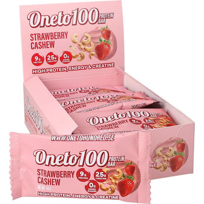 Proteiinipatukka, jossa on mansikan ja cashewpähkinän maku, rikastettu muna-proteiinilla ja kreatiinilla. Sisältää 9 g proteiinia ja 2,5 g kreatiinia patukkaa kohden ilman lisättyä sokeria.