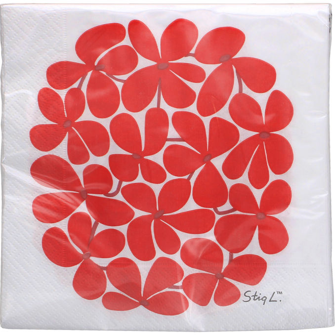 Valkoiset servetit, jotka on koristeltu punaisilla graafisilla kukkakuvioilla. Täydellinen valinta sekä arkeen että juhlaan, kun haluat lisätä värikkään yksityiskohdan pöytään. Stig Lindbergin suunnittelema.