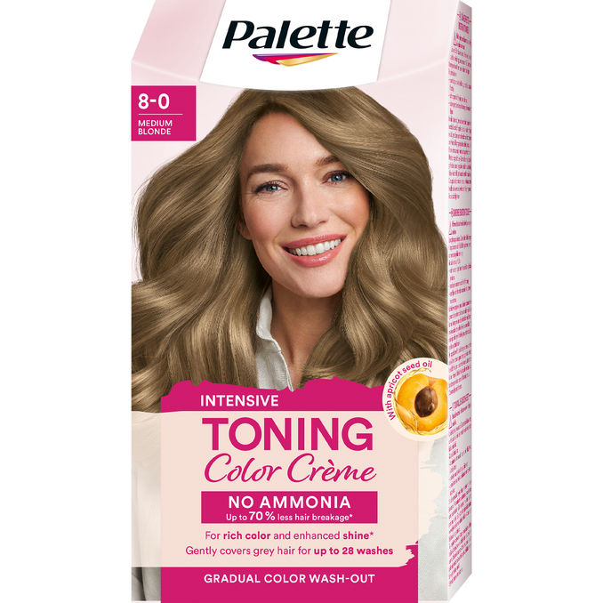 Palette Intensive Toning Color Crème 8-0 Medium Blonde Demi-permanent - Ammoniakiton hiusväri, joka peittää hellävaraisesti harmaat hiukset ja kestää jopa 28 pesukertaa