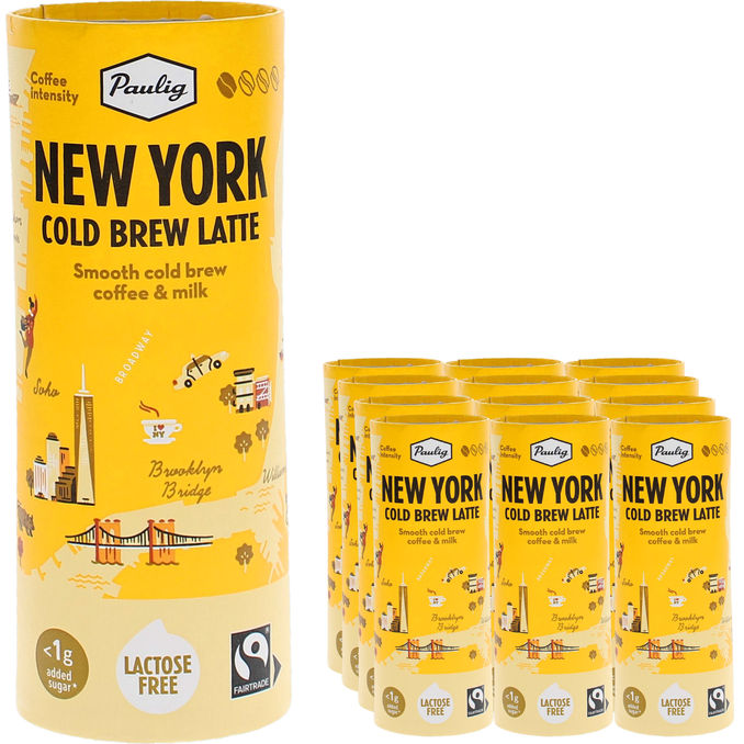 Paulig New York Cold Brew Latte on pehmeä maitokahvijuoma, joka saa makunsa Pauligin Cold Brew kylmäuutetusta kahvista. Kahvijuoman vivahteikas ja luontaisesti makea maku syntyy uuttamalla vastajauhettua kahvia 16 tuntia kylmässä vedessä. Paulig New York Cold Brew Latte kylmä juoma saa inspiraationsa New Yorkin kahvikultuurista ja sopii erityisesti aidon kahvin ystäville, jotka etsivät käteviä vaihtoehtoja kuumille kahvijuomille. Paulig New York Cold Brew Latte on laktoositon ja Reilu Kauppa -vastuullisuussertifioitu. Ympäristöystävälliseen kartonkitölkkiin pakatut tuotteet on helppo ottaa mukaan ja nauttia silloin kun haluat.