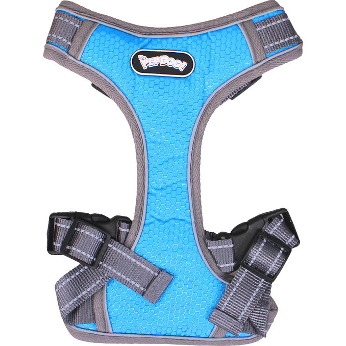 Mukava koiranvaljas pehmeästä ja pehmustetusta materiaalista, jossa on sininen etuosa ja säädettävät harmaat hihnat varman istuvuuden takaamiseksi. Valjaissa on kätevät pikalukot ja heijastavat yksityiskohdat, jotka tekevät ulkoilusta sekä mukavaa että turvallista koirallesi.