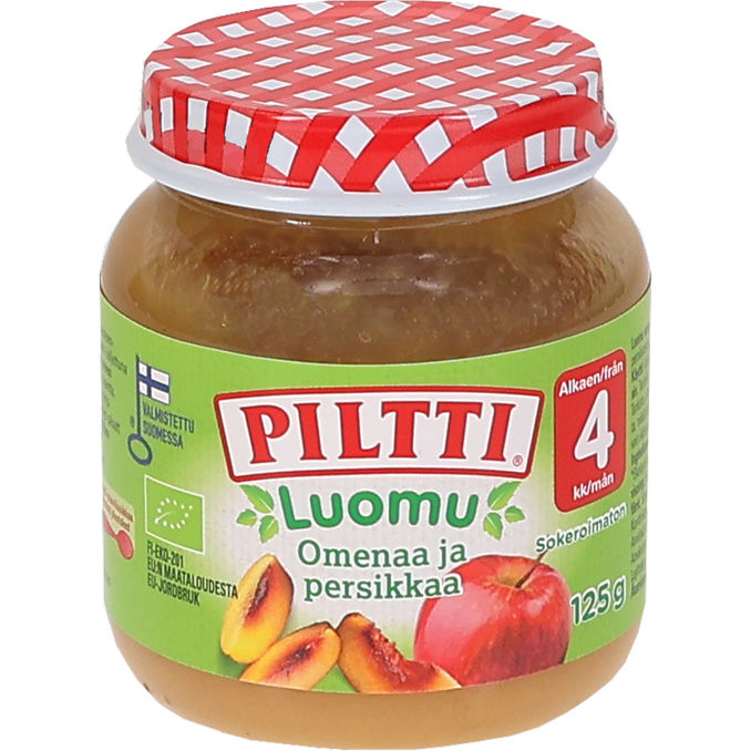 PILTTI Luomu Omenaa ja persikkaa hedelmäsose on 100% hedelmää ilman lisättyä sokeria tai mehutiivisteitä, ja se soveltuu jälkiruoaksi ja välipalaksi vauvalle 4kk iästä alkaen.