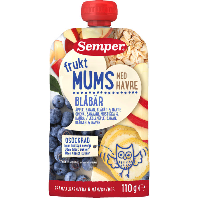 Semper Havremums Mustikka & kaura on raikas ja herkullinen omenaa, banaania, mustikkaa ja kaurahiutaleita sisältävä hedelmäsose. Sopiva lasten ja koko perheen terveellinen välipala smoothie tai jälkiruoka. Sose soveltuu lapsille noin 6 kuukauden iästä alkaen.