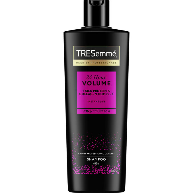 Haluatko tuuheammat hiukset, jotka tuntuvat kuitenkin kevyiltä ja liikkuvilta? TRESemmé 24H Volume -shampoo on kehitetty erityisesti ohuille ja latteille hiuksille tekemään niistä paksumman ja terveemmän näköiset ja tuntuiset. Kollageenin ja silkkiproteiinien yhdistelmä antaa hiuksille tuuheutta ja volyymia 24 tunniksi latistamatta niitä. Tulos: Paksummat ja kiiltävämmät hiukset, joissa on luonnollista, ihanaa liikettä. 24H Volume -shampoon käyttö: Purista runsaasti shampoota kämmenelle ja hiero märkiin hiuksiin. Hiero varovasti hiuspohjaa ja hiusten tyveä ja vaahdota. Painele shampoota kevyesti hiusten tyvestä latvoihin. Huuhtele huolellisesti. Jos haluat erityisen paljon tuuheutta, suosittelemme jatkamaan käsittelyä TRESemmé 24H Volume -hoitoaineella.